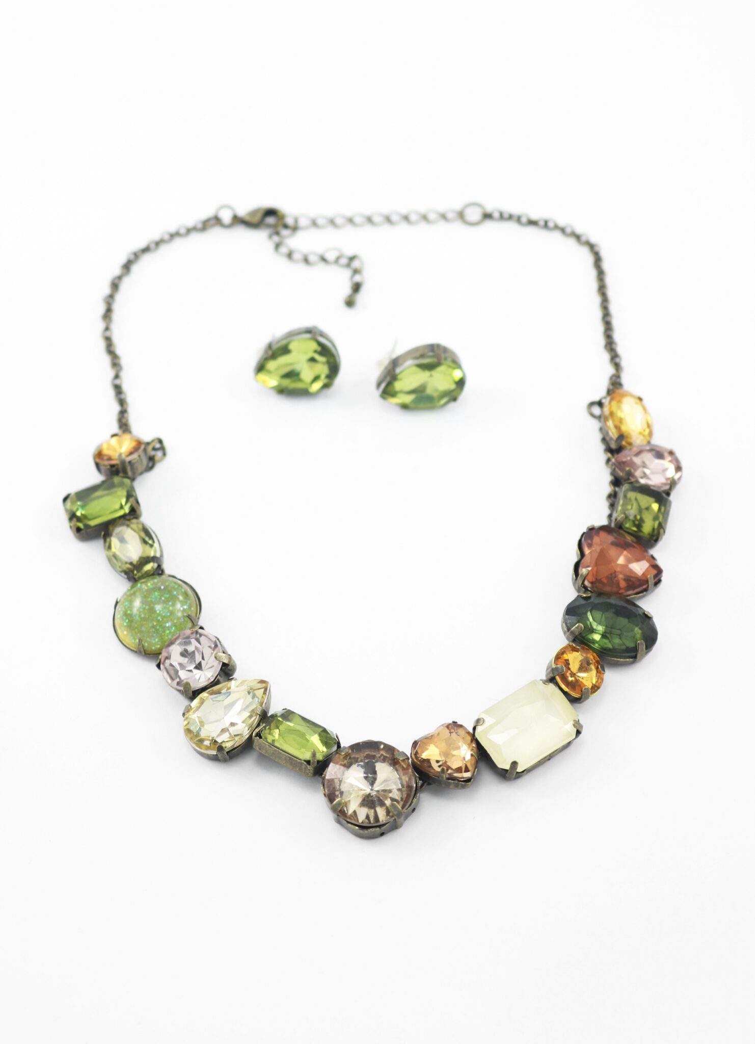 Collar de mujer con piedras en tonalidades de verde y el par de aros haciendo juego